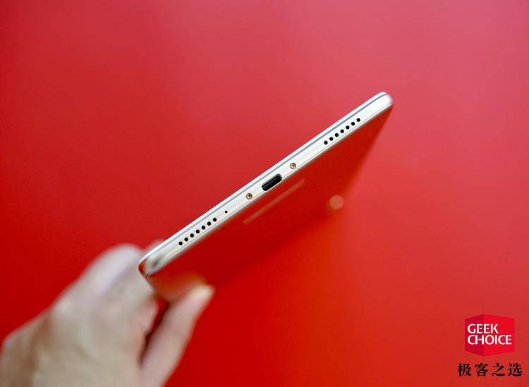 接口部分,小米平板 4 在顶部保留了一个 3.5 毫米耳机插孔,底部是 USB Type-C 接口和两个扬声器(嗯,两个开孔下面都有扬声器,不是装饰)。